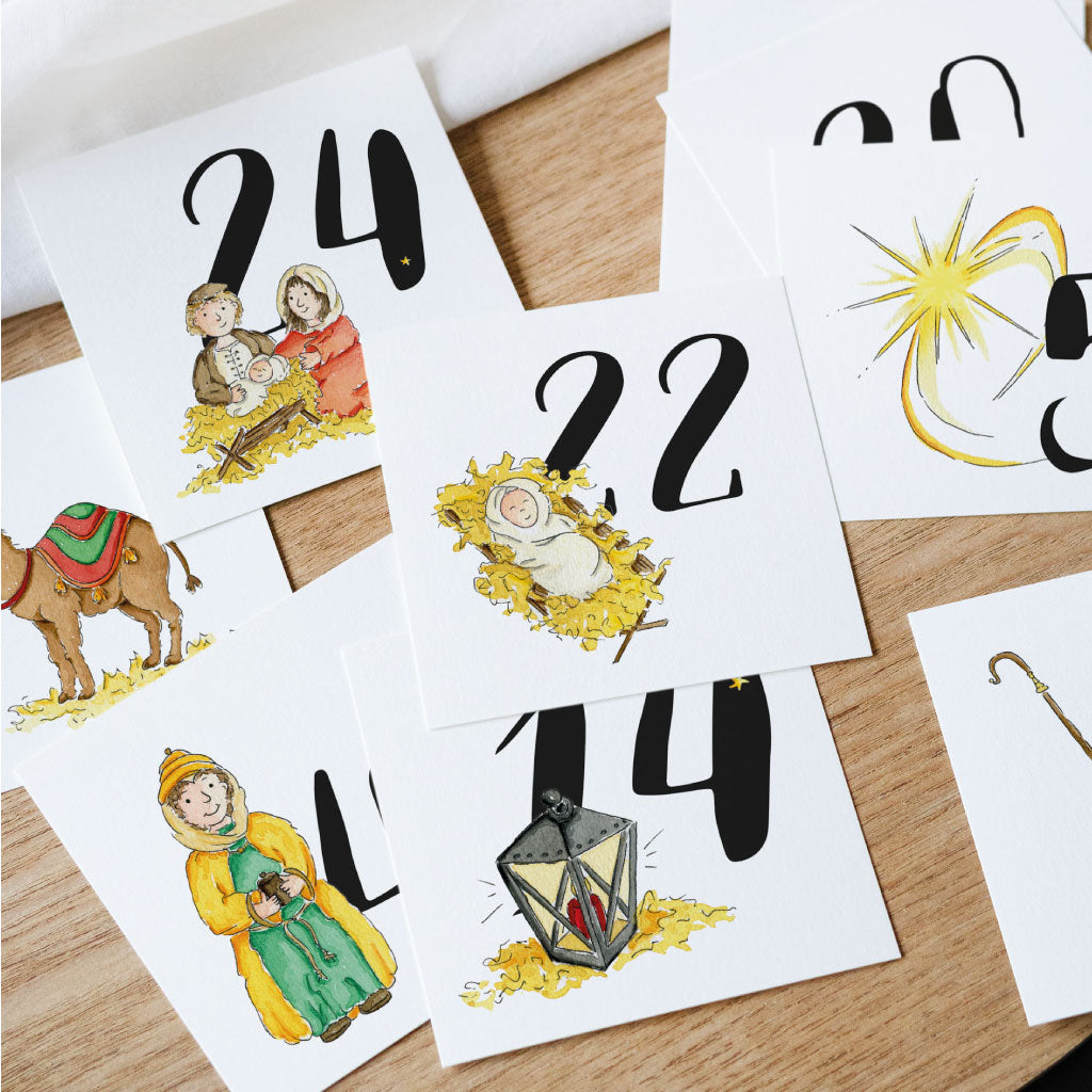 Wenn du die Szenen nicht nur im Herzen tragen, sondern auch im Alltag betrachten möchtest, dann findest du unter diesem Artikel unsere DIY Adventskalender. Jedes Motiv wurde liebevoll handgemalt und erzählt die Geschichte auf seine eigene, stille Weise.