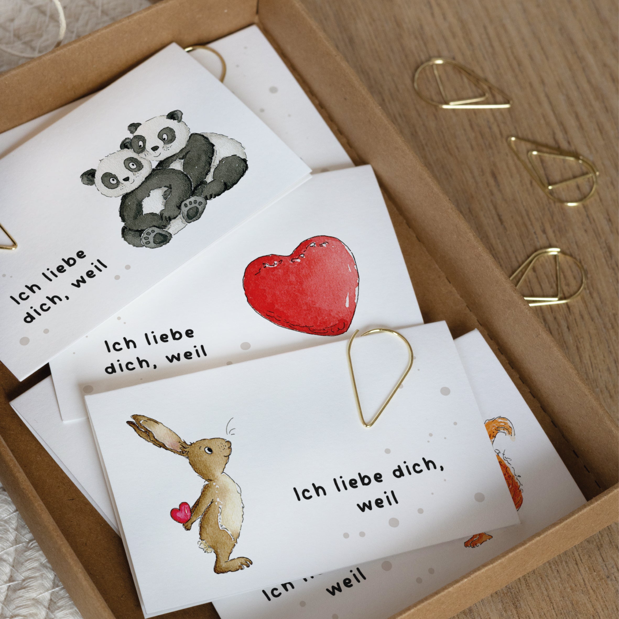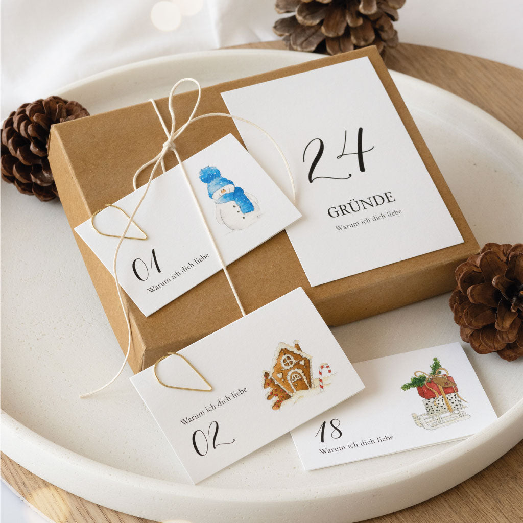 Das kommt ganz auf dich an! Manchmal reicht ein einziger, ehrlich formulierter Satz. Du kannst aber auch 10, 24 oder mehr kleine Gründe auf mehreren Kärtchen sammeln - wie bei unseren Mini-Liebesbriefen oder dem Adventskalender „24 Gründe, warum ich dich liebe“.
