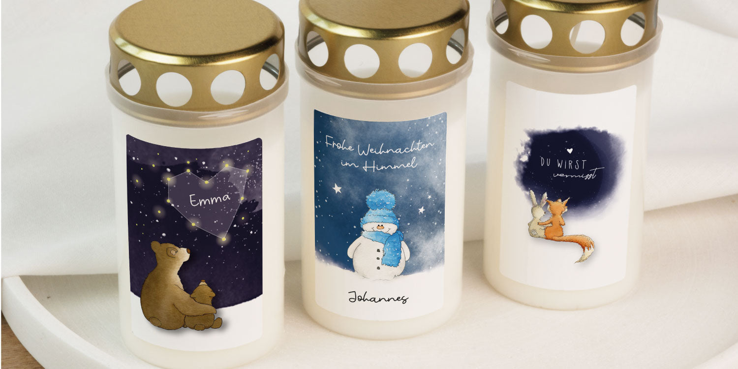 Unsere liebevollen Aquarell Motive machen jedes Grablicht zu einem besonders schönen Symbol zum Gedenken an Sternenkinder und Erwachsene. Viele davon sind sogar mit einem Namen personalisierbar.