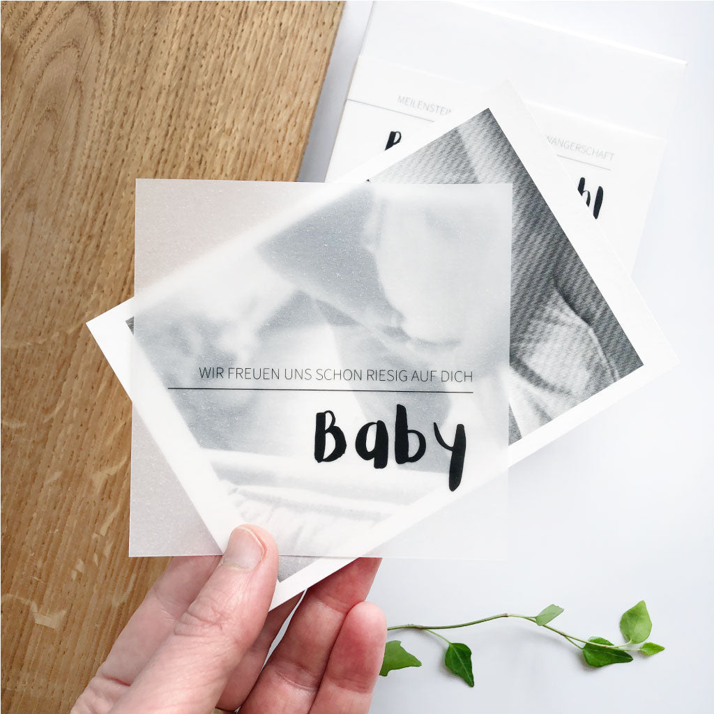 Als besonderes Highlight haben wir Meilensteinkarten zur Schwangerschaft auf hochwertigem stabilem Transparentpapier. Auch hier bekommst du Infos zur Größe deines Babys in der jeweiligen Schwangerschaftswoche. Durch den farbigen Druck auf