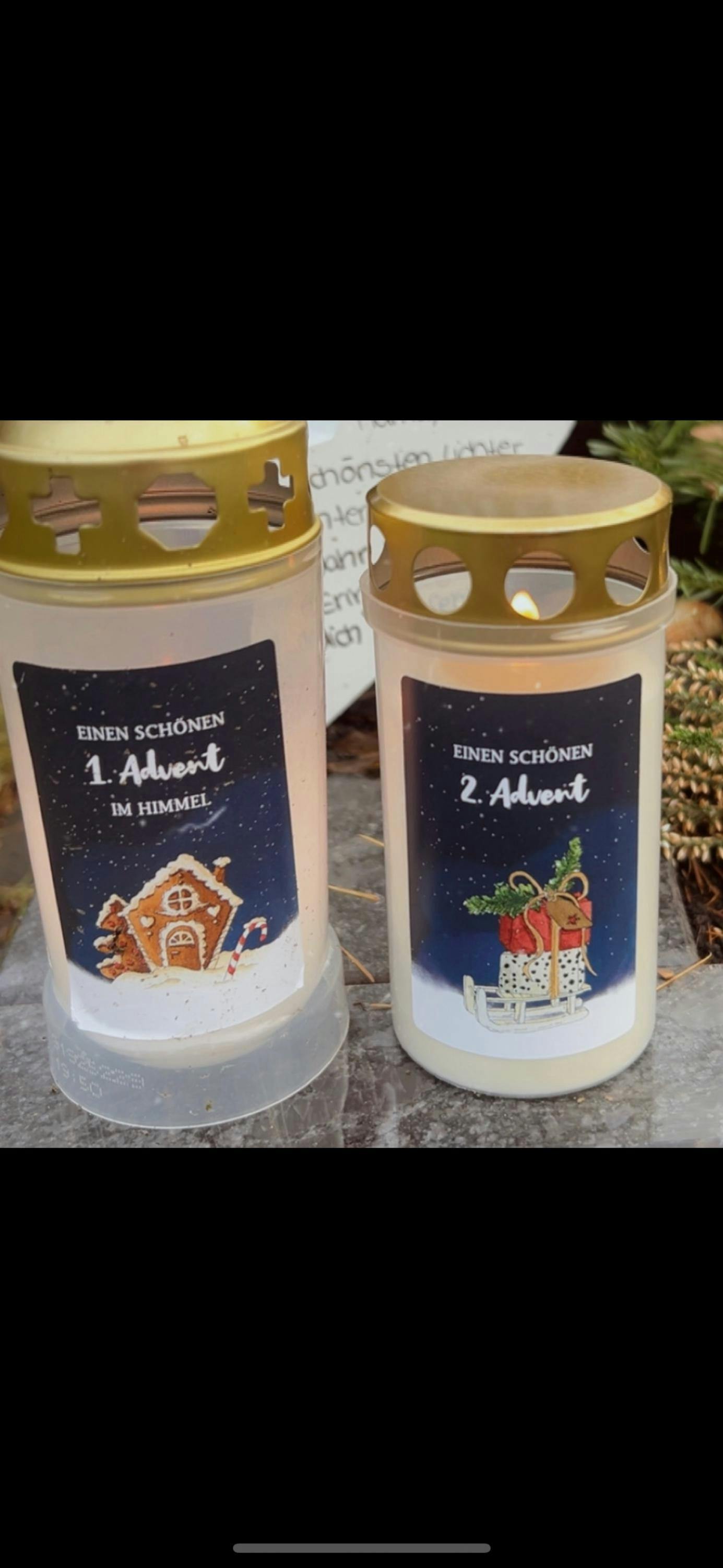 Wenn die Welt im Lichterglanz der Weihnacht erstrahlt, darf auch ein Licht für unsere Lieben im Himmel nicht fehlen. Dieses Set enthält fünf Aufkleber für Grabkerzen, einen für jeden Adventssonntag und den Weihnachtstag, um an diesen festlichen Tagen an die Verstorbenen zu erinnern.