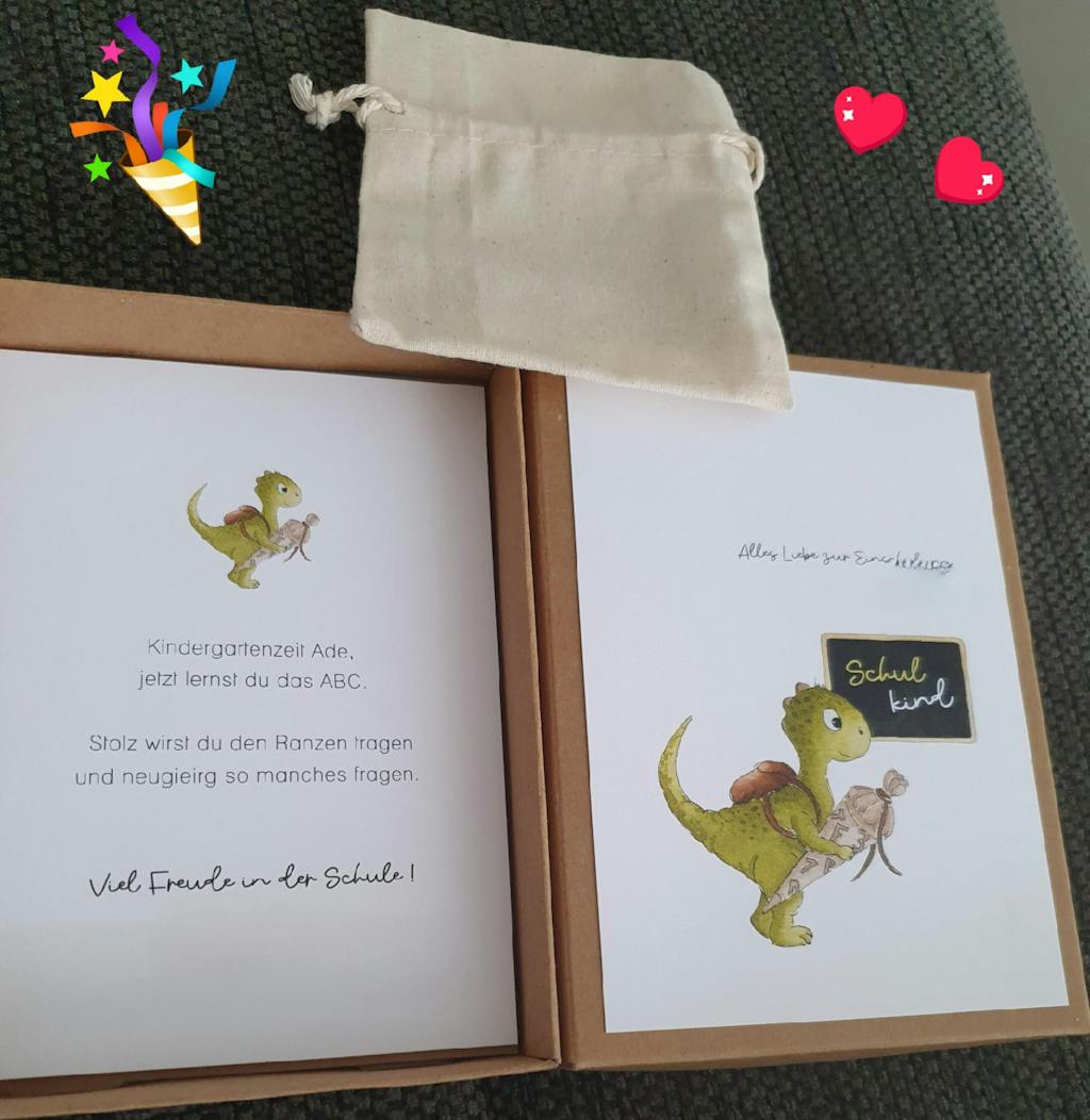 The big day of starting school is here. How exciting! Our strong dinosaur gift box is a great idea to congratulate a child on their first day of school. You can give them small sweets or a cash gift in it. You can also order a matching cotton bag for this.
