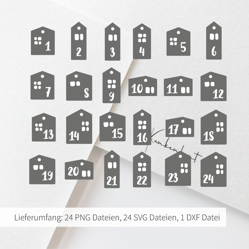 Hast du auch Lust dieses Weihnachten einen Adventskalender für deine Lieben selbst zu gestalten und zu befüllen? Dann hast du hier schon die passenden Zahlen in Form von kleinen Häusern gefunden. Du kannst sie aus Karton oder Folie plotten, ganz wie du magst. Als Anhänger oder Aufkleber. Für einen absolut einzigartigen Adventskalender!
